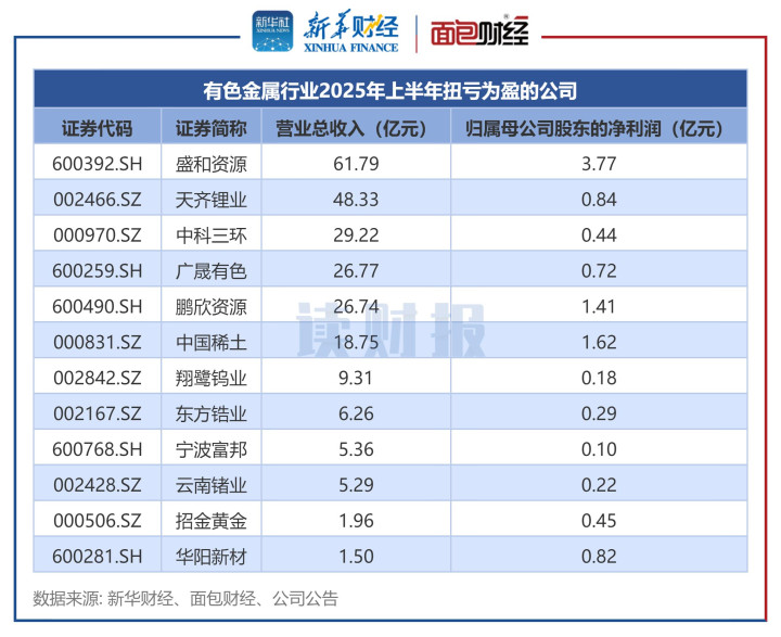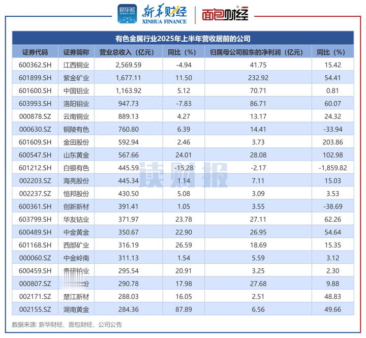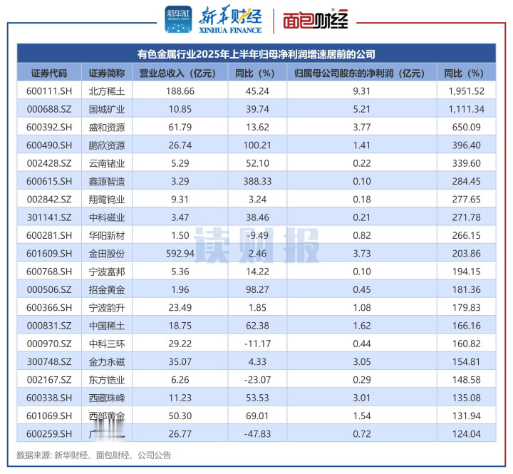 新华财经和面包财经研究员梳理公开资料显示,受益于产品价格上涨融期策略,2025 年上半年申万有色金属行业141家企业2025年上半年合计实现营收1.82万亿元,同比增长6.49%;归母净利润合计953.63亿元,同比增长36.55%。