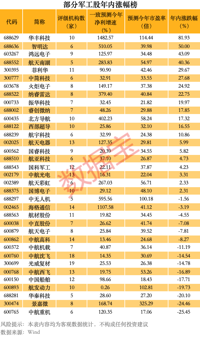 据证券时报·数据宝统计,5家以上机构评级的国防军工股票合计有35只,其中17股机构一致预测今年、明年及2027年净利增速均超20%。值得一提的是,机构一致预测智明达、航天南湖、华丰科技等未来三年净利增速均超30%。
